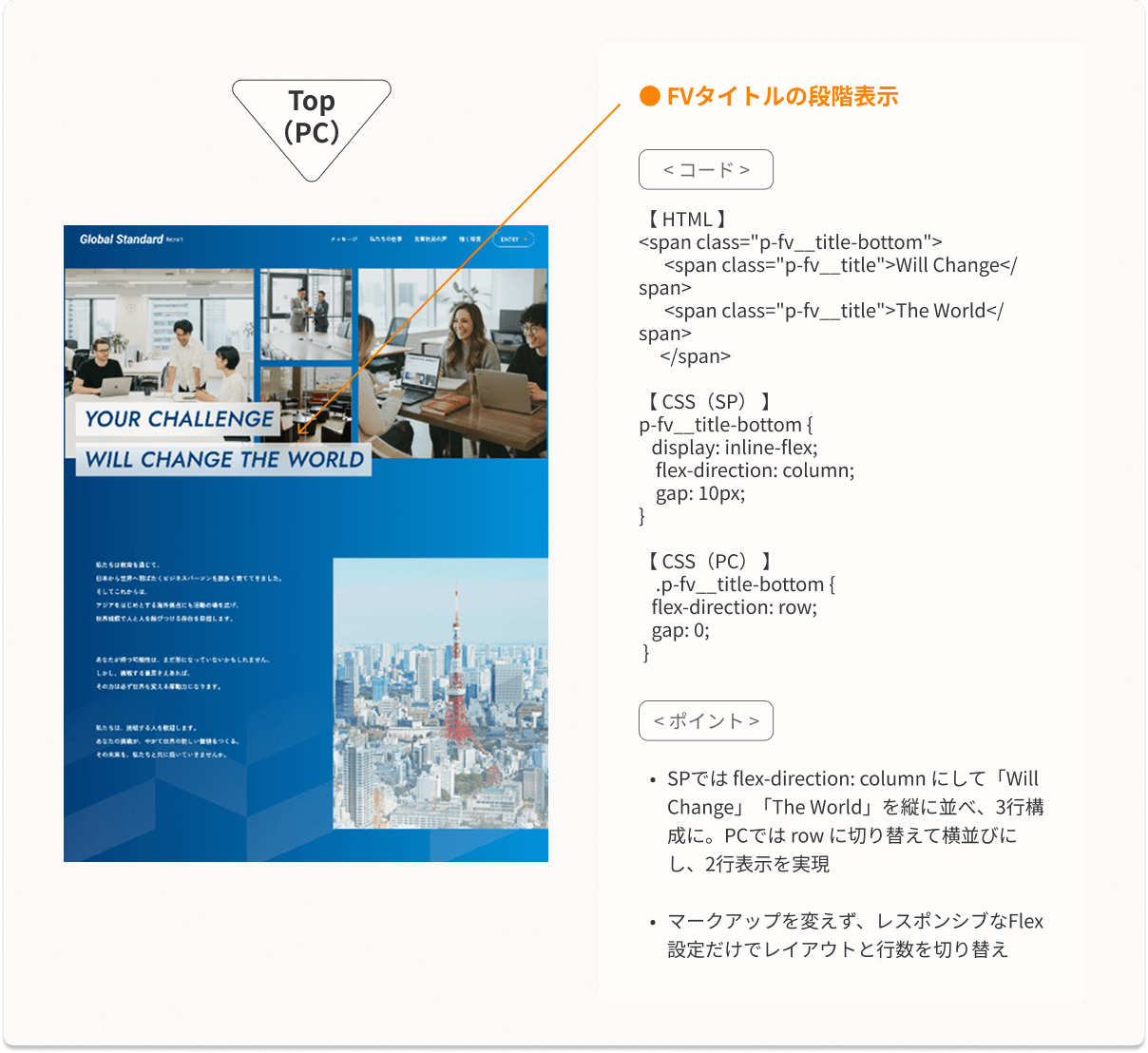 • テキストを1文字ずつ “span” に分解し、通し番号を振ることで、左上から右下へ流れるような色変化を実現。