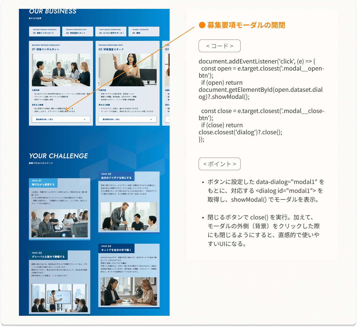• href="#..." のリンクは通常だと縦に移動してしまうため、preventDefault() を使ってその動きを無効にし、横スクロール用の処理だけを実行している。