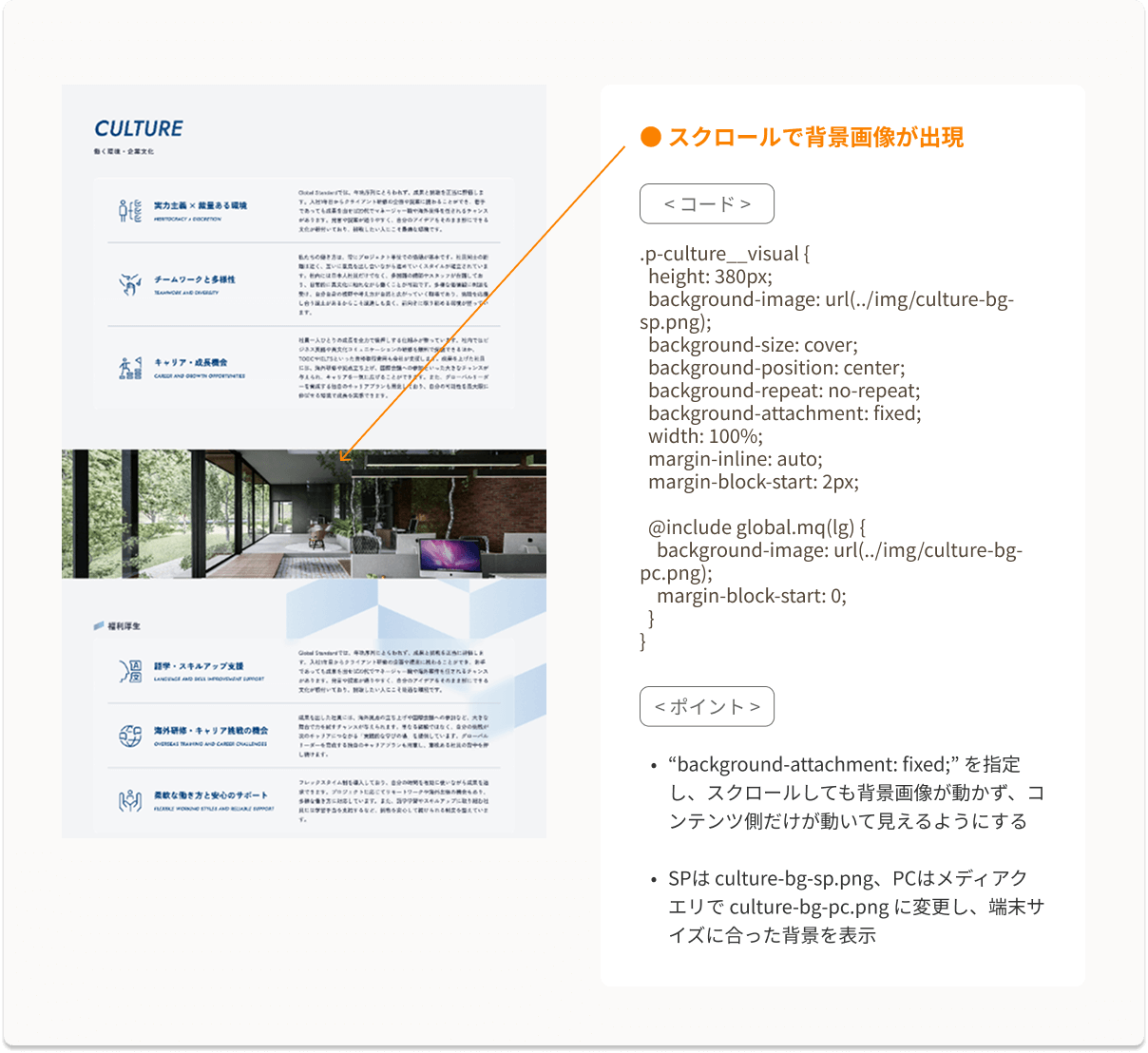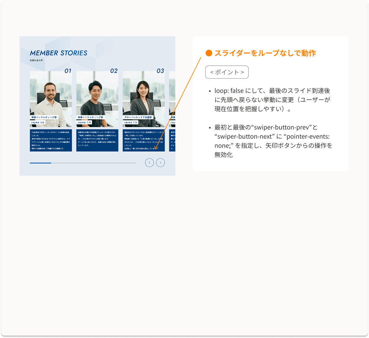 • クリックされたリンクに対応するカードの位置を取得し、カード一覧の表示位置と比べて必要な横移動量を計算し、scrollTo でなめらかにスクロールさせている。