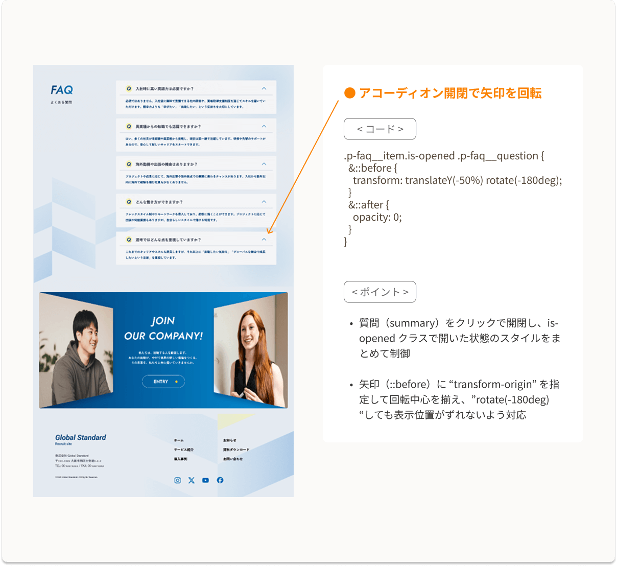 • セクションが表示領域に入ったタイミングでクラスを付与し、”transition” によって滑らかに開くアニメーションを実行。